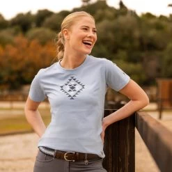 The Zion women’s T-shirt is made of cotton fabric that feels comfortable against the skin. The chest features a large Aztec inspired print in matching colors. Both sleeves have smaller versions of the pattern.