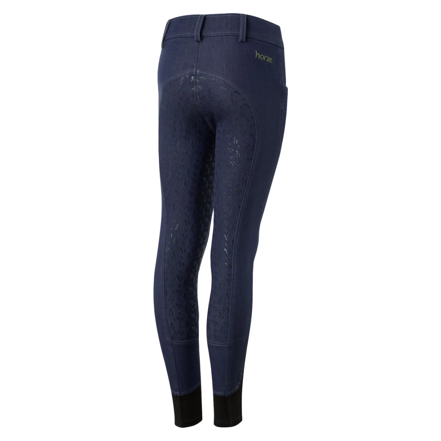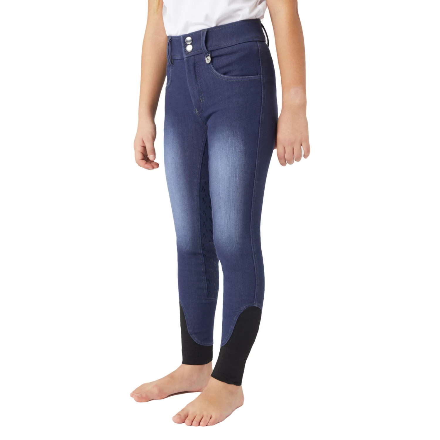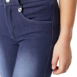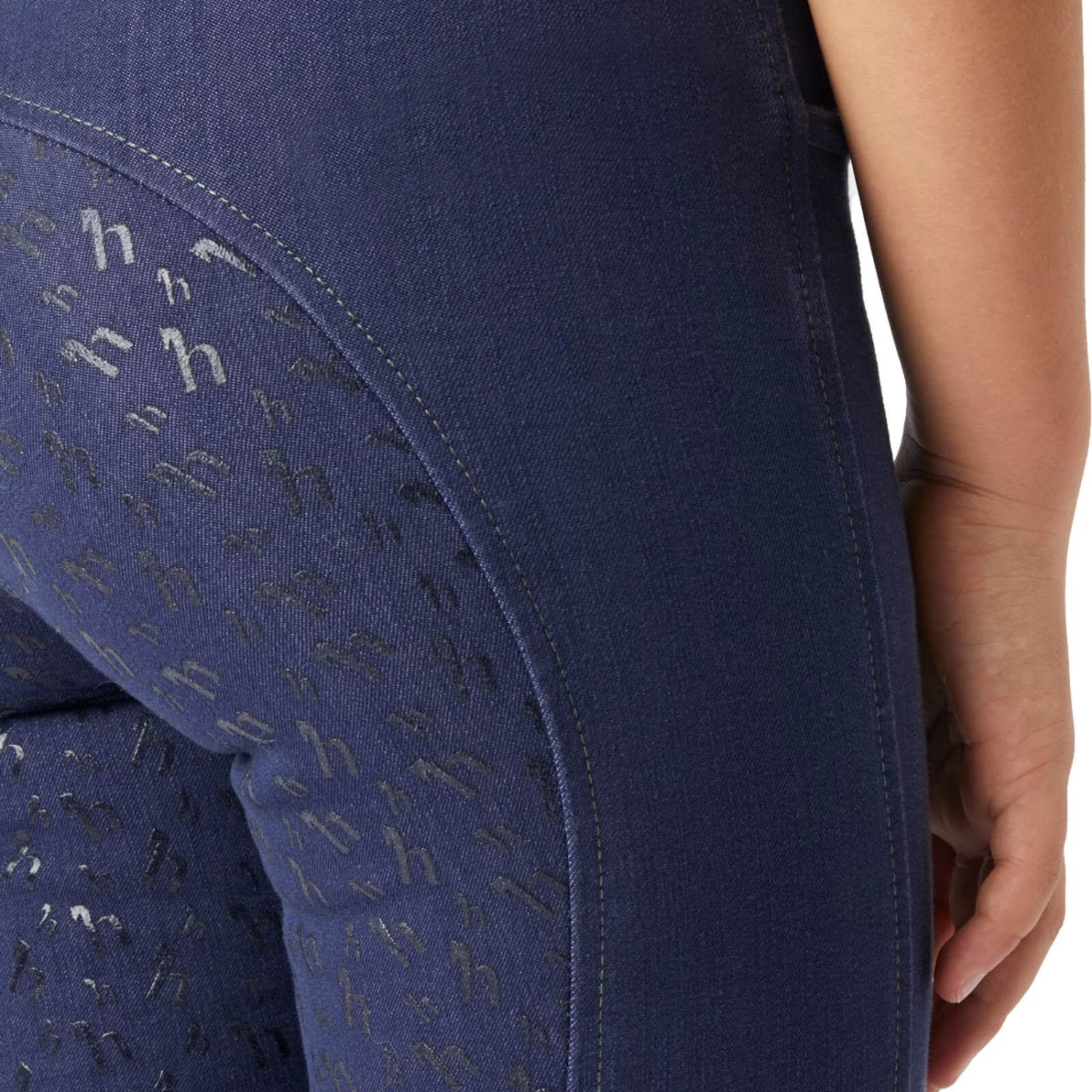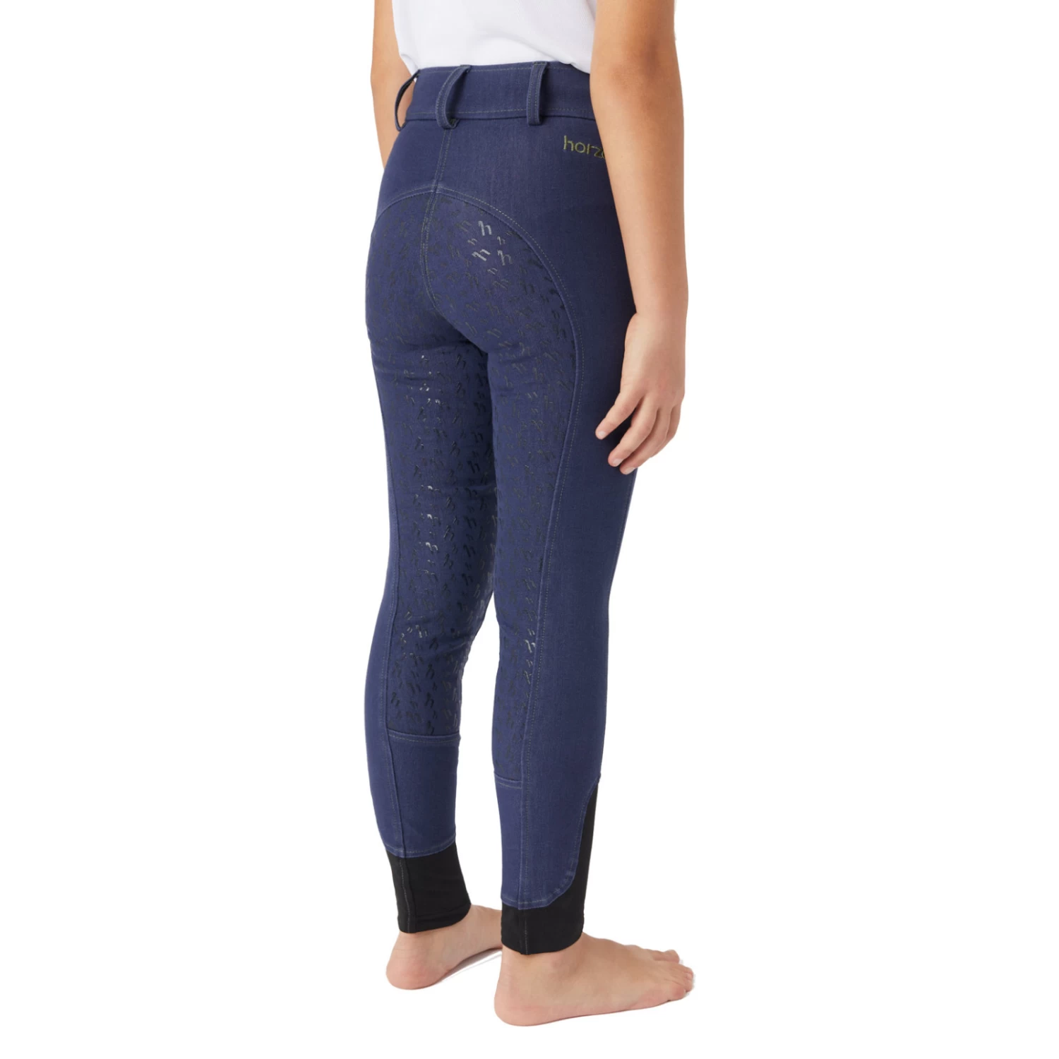 These kids’ denim breeches with silicone full grip provide you with comfort and support in the saddle while looking trendy. Dark blue denim with washing and constrasting gold stitching. A real eye-catcher in the stable! To provide you with extra comfort when wearing boots, the leg cuffs are made of black elastic.