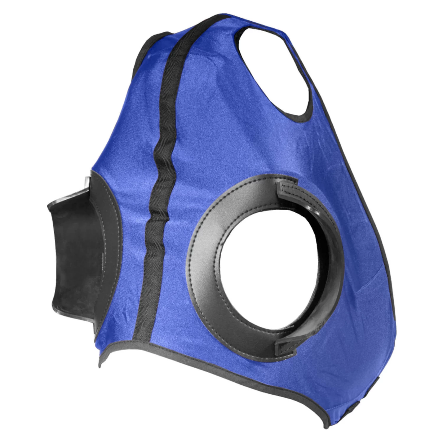 This race hood is made of soft and stretchy spandex and elastane material for a close, comfortable fit. It includes stationary, stitched down half cups positioned to keep your horse focused on the race ahead. This hood secures under the chin with clips and adjustable hook and loop closures for a custom fit.
