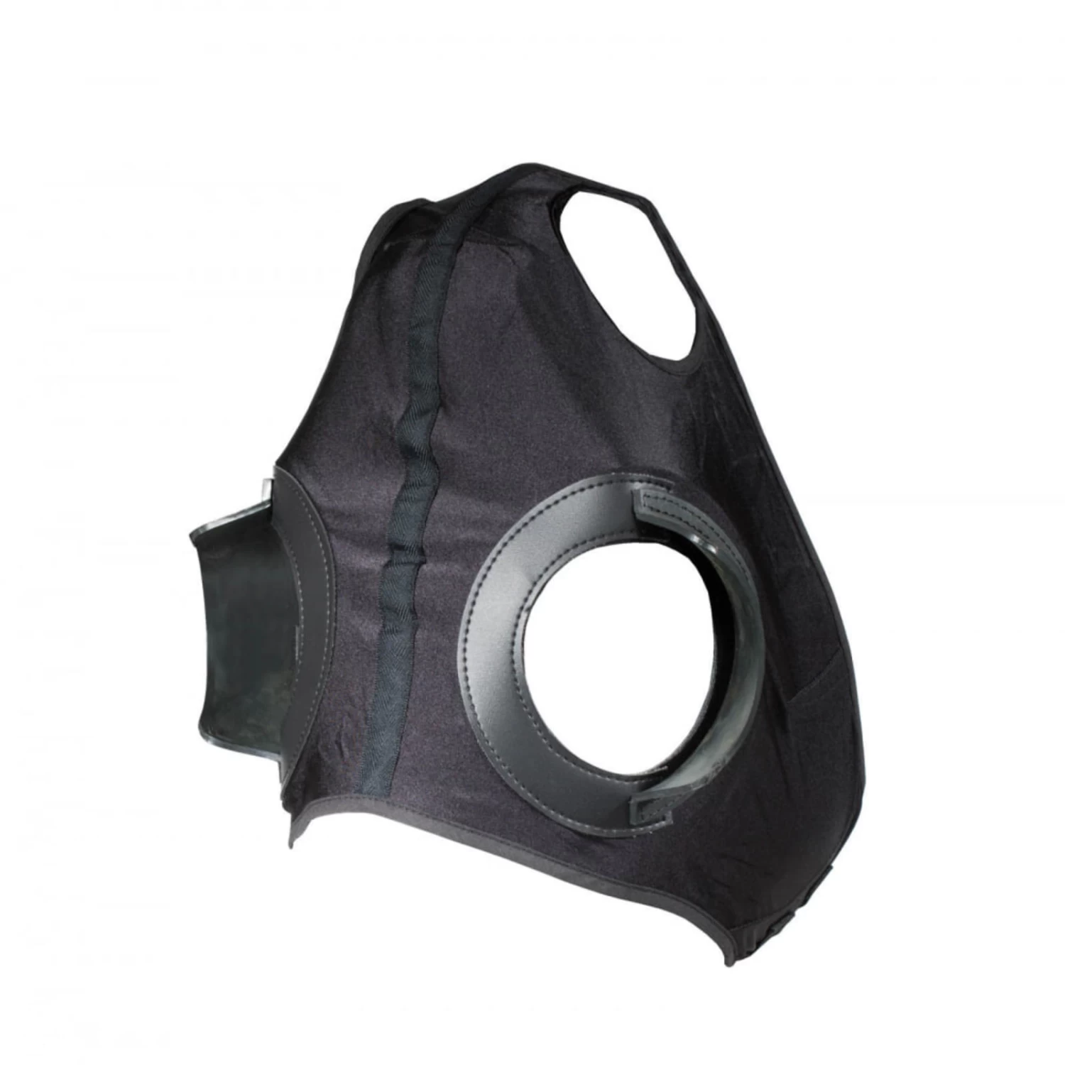 This race hood is made of soft and stretchy spandex and elastane material for a close, comfortable fit. It includes stationary, stitched down half cups positioned to keep your horse focused on the race ahead. This hood secures under the chin with clips and adjustable hook and loop closures for a custom fit.